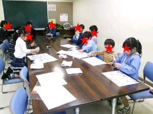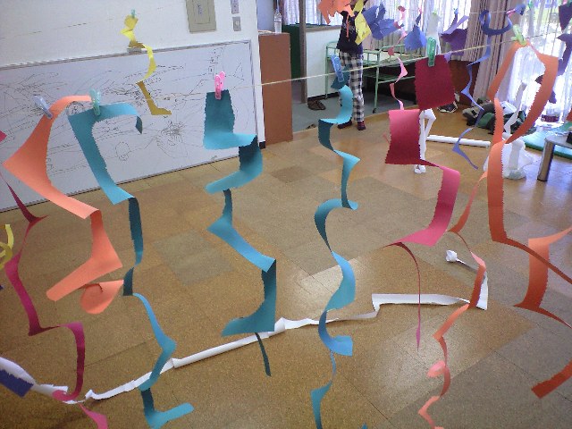 ゴールデンウィークのまっただ中の子どもの日、参加人数はぐっと少なめのあそび山でした。まず、ホワイトボードに好きな世界を描きました。イメージを膨らまし、ウォーミングアップ。どんな世界にするか、話し合って協力して描きました。どんなテーマ?と聞くと、【宇宙戦争】ということでした。では、この部屋を宇宙空間のようにしていこう!まず、紙をぐるぐるっと切っていき、吊るして行きました。できるだけたくさん!なんに見える?宇宙の障害物?シールドみたい!などと話しながら、ぐるぐる切っては吊るして行きました。その後、丸シールを貼っていきました。なんか鯉のぼりみたい!あ!いつの間に、、、うさぎ!!目みたいにみえる!この後、この紙々を狙い、輪ゴム鉄砲で撃っていきました。さぁ、宇宙戦争、はじめー!!大いに盛り上がりました~今回もありがとうございました!*2012年度 会員募集のお知らせ**木曜チーム第2・4木曜日 15時40分~17時30分*土曜チーム第1・3土曜日 13時~14時50分4歳から小学6年生まで。未就学児さんは親子参加をお願いします。東村山市中央公民館 (東村山駅、イトーヨカドー隣)定員になり次第、締め切りになります。初めての方は、体験(1500円)からお願いします。5月の予定*土曜日チーム:5月5日、5月19日木曜日チーム:5月10日、5月24日異年齢の少人数制で行なっています。(定員~8名)詳しくは、ブログのメッセージを送るところから御連絡いただくか、下記まで御連絡ください。☆☆☆☆☆☆☆☆☆☆☆☆☆☆☆090-3536-4793 (平日は19時から21時まで)i-haru3711@ezweb.ne.jpあそび山の連絡係り:イワマさんまで☆☆☆☆☆☆☆☆☆☆☆☆☆☆☆皆様のご参加をお待ちしております。 造形アトリエあそび山 橋本加奈子 080-5191-0094 kanako.lily-paris.25@esweb.ne.jp (こちらでもお申し込みお受けしています)