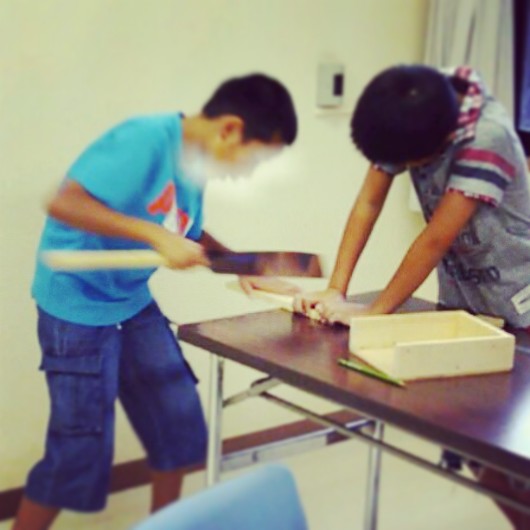 こんにちは!毎日、猛烈に暑いですね~ちょっと更新遅れましたが、7月の2回めの制作の様子です。木がやりたい!というリクエストに答えて、木箱つくりをしました。木を加工するのが初めての子が、たくさん。のこぎりで切ったり、釘打ちしたり、ヤスリかけたり、など、みんなほぼ初めての体験でした。自分で考えた大きさの箱をつくりました。みんな同じ大きさ、厚みではなく、それぞれどんな箱にしようか考えながら、つくりました。なので、みんなバラバラの大きさ、形です。大きいのをつくる子もいれば、小さいものをつくる子もいて、トレーにしようかな~、筆箱にする!という風にそれぞれ考えながら、つくりました。途中で木が足りなくなり、当初の自分の考えていた大きさにできない子もいましたが、そこから、また切り返して、好きな形に加工していったのは、見事でした。毎回、たっぷり、材料は用意しています。あらかじめ、同じ大きさに加工すれば、そういうアクシデントもないのですが、好きな大きさ、形にしていく過程を経験していってほしいことから、そういうことになってしまいました。キット化されたものをただ組み立てるより、ずっと頭をフル回転して、形にしていくよい経験になって行くと考えます。悔しかったと思いますが、切り返して、つくり直した子は、とてもよい経験ができたと思います!では、水曜日の様子~土曜日の様子~今回は、木の彫刻を長年やっている助手(夫)も、お手伝いにきてくれ、二人体制で行いました。ありがたい。できあがった木箱にコーヒーで着色していきました。水曜日のみんなの作品土曜日のみんなの作品これから、次回はニスを塗っていきます。今回も、ありがとうございました!!次回、水曜日は、8月28日のあそび山スペシャルです。土曜日は、あそび山スペシャルを終えたので、9月7日です。体験を希望の方は、9月以降にお願いします。造形アトリエあそび山asobiyama@gmail.com080-5191-0094はしもと