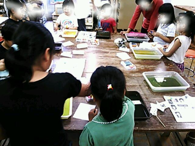 7月1回目は、急に暑くなったので、涼し気なワークを、、、と思い、水に浮かんだインクの模様を写しとるマーブリングをすることにしました。土曜日の様子水曜日の様子水の動きが模様になるマーブリングは、予想もしない不思議な模様になります。そのマーブリングした紙を使って、うちわにしていきました。好きなようにレイアウトしたり、絵を描いたり、、、自由な発想で、オリジナルのうちわができました!土曜日のみんなの作品水曜日のみんなの作品夏祭りのお供に使って下さいね!今回もありがとうございました! 造形アトリエあそび山 はしもと asobiyama@gmail.com 080-5191-0094