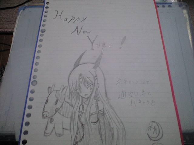 夜天「いろいろとありまして、一時的にネットに繋げませんでした(汗」美空「帰ってきた日に、更新すれば良かったのに」夜天「まぁ、そうなんだけどね。とりあえず、祖母の家から帰ってきてパソコンをやったのは良いのですが疲れも溜まってたので記事を更新せず、すぐ寝て朝(すでに昼過ぎだったけど)起きたときには、なんかネットに繋げない様なバグが発生しておりまして、つい先ほどようやく改善できました」美空「結構掛かったよね…」夜天「ルータ買ったり、パソコンの設定弄ったりで散々だったよ、主に兄貴が」美空「やっちゃん何も手伝わなかったもんね…」夜天「ただ、起動しないゲームの原因を突き止めたくらいだな」美空「いや、役だってないじゃん」夜天「そりゃ、友達の美術の宿題手伝ったり遊びに行ったりで家に居なかったし」美空「相変らず、最低だね…」夜天「いつもの事さね。つか、新年の絵どうしようか」美空「いや、描けてるんだからそれをあげたらどうなのよ?」夜天「正直、面倒なのだけど」美空「良いじゃない、別に」夜天「……描かれてないからって」美空「い、良いでしょ…別に」夜天「はぁ……」美空「溜息吐いてないで、ほら」夜天「仕方ないな……では、遅れましたが」夜天&美空「新年、あけましておめでとうございます!皆様、今年もよろしくおねがいします」