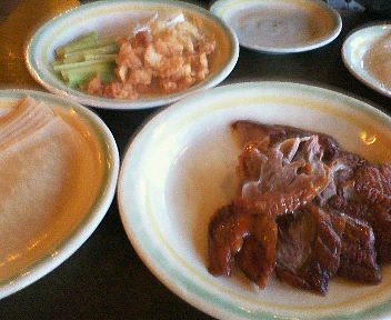 前回「北京ダック専門店 中国茶房 8」六本木店に行ったことを書きました。また北京ダックを食べたくなり、今回は恵比寿店に行くことにしました。 恵比寿店は少し分かりにくい場所にあるので、行く前に確認して下さい。店は3階にあり、午後3時頃行ったので店の中はのんびりしていました。早速北京ダックを注文して、そして恵比寿店限定 特別大餃子と前菜1品も注文しました。前菜と大餃子が来ました。大餃子は約20センチの大きさで、中くらいの皿にドーンと飾り気もなく乗っていました。ただでかいだけの餃子かと思いながら、ナイフとホークを使い餃子を切りました。すると中に溜まっていた肉汁が、飛び出す瞬間を待っていたかのように、お皿一面にあふれ出しました。これには「おー」と言ってもおかしくないくらい驚きました。餃子の皮は大きいだけあって厚いけれど、染み出た肉汁の味が染み付いて美味しいです。 餃子を食べ終えた頃、コックさんが北京ダックを丸ごと持って来て「これになりますけど、いいですか」と聞かれます。そしてさばき始めて、肉厚の北京ダックの皮が、お皿いっぱいに盛られて運ばれて来ました。その後その残った鶏肉で炒め物とスープが出て来ます。これもそれなりの量があり、別注文で白いご飯が欲しくなります。 この食べ応えで大体¥5000前後は安いと思います。・北京ダック専門店 中国茶房 8 のホームページ