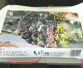 東北新幹線の一関駅で見つけました。一関は岩手県の南に位置して、近くには金色堂で有名な中尊寺があり、新幹線でここを訪れる旅行者はこの駅を利用します。 駅弁はその地方の文化や食材を背景を元にして作られるものが多いです。ここ一関は海は近くないですが気仙沼からの大船渡線が乗り入れています。そのこともあり「うにとイクラ弁当」があります。一関より少し北に行った所に前沢があるので「ローストビーフ弁当」も売られていました。その中で彩りの鮮やかな「創作弁当 源 義経 ~東下り絵巻~」があり、¥1100と少し高価でしたが購入して見ました。駅弁自体はそれ程大きくなくお腹いっぱいになるほどではないです(駅弁でまんぷくになるのことはないよな~?) お し な が き古代米(岩手県花泉産) 岩手県産椎茸の松笠煮三陸の海から秋刀魚の昆布巻、ほたて甘露煮 当地特産 地鶏の照焼き海老の天麩羅 里芋・人参の煮物、絹さや、ぎんなん 弁慶のほろほろ漬 当社自慢の前沢牛ローストビーフ おはぎ 創業明治二十三年 (株)斉藤松月堂
