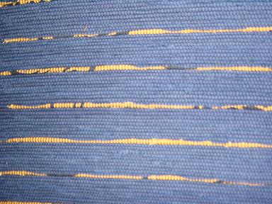 裂き織りはほんの少しの布もむだにすることがありません。先日シャツをつくっていただいたszenさんにおねだりをしてはぎれをいただきました。もともと黄色いだるまのプリントだったのですが、圧縮して紺地の模様にさせていただきました。残念ながらだるまのプリントの写真を撮り忘れてしまったのでどんな柄がこんな風になったかちょっと分かりづらいかもしれませんが1センチ幅に切り刻みそれをつなげてこのようになりました。よーく見ると黄色い中にだるまのラインが見えてきます!!(透視??)だるまくんの『痛いよ~』と言う声が聞こえてくるようですががまんしてくれ~う~んこれで何を作ろうかな?