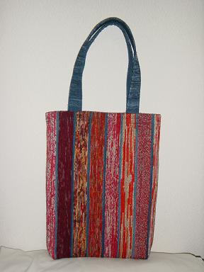 7月までに織るだけは織っていたので今月は縫製月間ということで本日も新作作らせていただきました^o^幅27センチ(底幅22センチ)×高さ28センチ×マチ4センチと、ちょっと小ぶりかな?よく『着物とかに合いそうですね』と言われますが、私的にはTシャツとGパンで持っていただきたいです。赤は着物の裏地、柄は表地を使いました。何も考えずに作っているので鞄の大きさもまちまちで2度と同じものが作れません!まぁよく言えば『一点もの』なのであります。