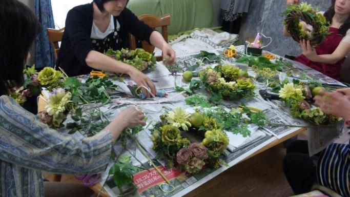 本日、久々にお花のお稽古に行って来ました先月お稽古をお休みしてしまい1月のレッスン以来4カ月ぶりのお稽古でしたので何から話をしたらいいかわからないほど話が尽きずそれはそれは賑やかなレッスンでした今日の作品は初夏にふさわしいさわやかなリース早速リビングに飾りました皆さま手慣れていらっしゃるのでマシンガントークをしながら手先もスピーディーに動くという素晴らしいレッスンでありますそして毎回のことながらさらなるお楽しみはレッスンの場所を提供してくださるN様がいつも作って下さるランチ!!本日は、トマトのクリームパスタ、ブルスケッタ、ポテトサラダ、スコッチエッグならぬスコッチトマト?、白身魚のカルパッチョなどなど 本当に美味しかった♪その後はデザートのケーキ!!自分のケーキを選ぶのに「なんでこんなに時間がかかるんだ!!」って思うほど悩みに悩む6人・・・私はシンプルなミルフィーユあ~~シアワセ♪そうそう昨日のやる気のない病の話をしたところみなさん1カ月の手帳が予定でびっしり埋まってしまうようなアクティブな方々ばかりなんですけどそんな方々も「こんな私でもやる気がなくなった!」と言っていました直接的には大きな被害がなかった私たちですがやっぱりあの地震によって少なからず精神的に不安定になっているみたいですみんな同じような症状だったのでちょっとホッとしました来月、お花のNAO先生主催で震災孤児の方々のためのチャリティーイベントがありますその時に作るものがこちらのバスケット!!どの色を作るか今日決めなくてはならなかったんですけどどれも可愛くてまたまたこれを選ぶのに選びきれなくて30分悩んだ私たち・・作って、しゃべって、食べて、こんなことで悩んで・・・久々に心が満たされた1日でした