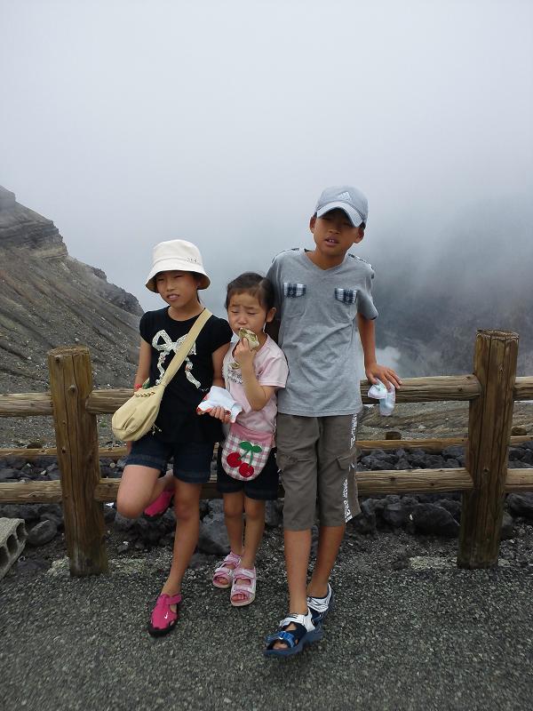 そして、阿蘇の噴火口へ。実は、私も妻も初めて。むろん子供達も初めてである。火口の近辺からロープウェイで噴火口まで行くことが出来る。大人1000円、子供500円。ということは、3500円!!まあ、何事も経験。噴火口に到着。煙がもうもうとしてる付近にエメラルドの湖(池?)が。そして、昔の噴火口付近がかなりいい感じ。噴火口から降りてくると、草千里。ちょっと雨模様で残念。帰りに菊池渓谷へ。土砂降りの雨のなか、記念撮影。思いで深い旅行となりました。