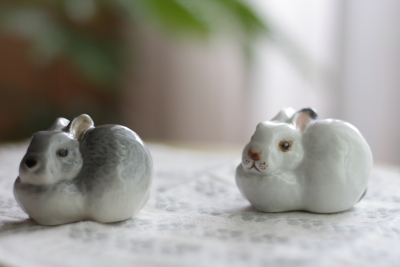 お久しぶりです。前回の更新から、あらら…、一週間も経っていました~いつも見てくださっている皆さん、すみません。今日ご紹介するのは、我が家の可愛いうさぎさんです。もちろん、置物ですが^^表情がなんとも言えないくらい、可愛いんです。特に、白うさぎのちょっとやんちゃな感じの表情。何か企んでいるのでしょうか…?下に敷いているのは、お友達からいただいたお気に入りのビンテージクロスです。訪問してくださってどうもありがとうございます☆→北欧雑貨へ