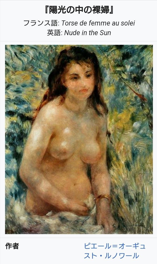 残り2つの短編について。 タンギー爺さん 背景に浮世絵が使われている、ゴッホの有名な絵。 そのモデルとなった画材商「タンギー親父」の娘が、ポール・セザンヌに宛てた4通の手紙、という構成になっています。 タンギー親父は、第一回印象派展のあまりの衝撃に、これから出てくる芸術家たちを支えようと、それまで行商をしていた画材を商う店を開きました。 そして、絵の具の代金の代わりに、売れない芸術家たちの絵を受けとるようになりました。 そして、画材屋兼画廊になった店では、多くの芸術家たちが集まり芸術論を戦わせます。 その会話の中に出てきたのが、ルノワールの『陽光の中の裸婦』。 Wikipediaより。 「死体が完全に腐乱している状態」と批評された絵です。 絵は見たことがあるし、その話は聞いたことがあるはずなのに、やはりショックを受けてしまいます。 肌を描くのに緑や紫が使われているから…とのこと。 そういえば、小学校かどこかに飾られていた絵が、顔に緑や黒などの色が使われているのに、離れてみるときちんと顔として認識できるのが不思議だったのを思い出しました。 ルノワールの場合は、緑の中にいて陽の光などを受けた様子から、そんな色が使われたのですが。 チューブ式の絵の具ができる前は、シリンジに絵の具を充填して使用していたそうです。 チューブ絵の具のおかげで、アトリエから飛び出して戸外での製作が可能になった… 当たり前ですが、画家だけでは絵は描けないのですね。 タンギー親父の娘への、スザンヌからの返信が細かに描写はされていませんが、内容から交流はきちんとあったことがわかります。 最初の手紙では、セザンヌのツケを払ってもらわないと店にある絵を差し押さえられてしまう、と告げています。 2通は、セザンヌの父へのお悔やみと、ツケを全部返してもらった報告でした。 遺産で払えた、ということですが、そのような返し方は悲しみを誘います。 セザンヌの友人で作家の、エミール・ゾラの話も出てきます。 彼の作品である『製作』は、セザンヌをモデルにしたような内容でした。 新しい絵画表現にこだわり、行き詰まって自殺する画家の話です。 これにより、セザンヌはゾラと交流を絶ちます。 そのことも、タンギー親父の胸を痛めました。 3通めは、パリに帰るセザンヌのために、タンギー爺さんがアパルトマンを見繕った報告です。 店にはゴーギャン、ベルナール、ゴッホなども訪れるようになりました。 ゴッホは絵の具代の代わりに、タンギー親父の絵を描きます。 それが、この話のタイトルでもある『タンギー爺さん』でした。 ベルナールやゴッホはセザンヌの絵を絶賛します。 他のたくさんの画家の絵もあるから、ぜひ店を訪ねるようにという内容でした。 4通めは、タンギー親父が亡くなり、店を閉めた報告です。 たくさんの絵画はオークションにかけられましたが、想定よりずっと安値にしかなりせんでした。 ピサロ、モネ、セザンヌ、ゴッホ、ゴーギャン、スーラ、ベルナール。 まるで美術館に住んでいるようだ、というタンギー親父の言葉はまさにその通りで、今ならいくらになったことでしょう…。 描いた画家に、絵の具代として受け取った画商に、まったくその恩恵がいかなかったのが悲しいです。 店はその後雑貨屋になりましたが、若い画家がタンギー親父の店で絵の具を買おうとやってくるそうです。 画家の卵たちを優しく見守る、父親のような存在でした。 タンギー親父は、セザンヌのことを「ほんとうに特別」と話していました。 その言葉に対するセザンヌの感情表現がないところが、本当に上手だと思います。 ジヴェルニーの食卓 モネと義理の娘ブランシュの生活とその過去を描いた作品です。 ブランシュの父エルネストが百貨店を経営していたとき、絵の製作を依頼されたモネは、モンジュロンの邸に滞在します。 次女のブランシュは、パリの自宅にあった『印象 日の出』の作者と知り喜びます。 エルネストはモネのパトロンでした。 11歳のブランシュは、ささやかな手伝いをする「助手」となります。 母アリスが出産後、父の会社が倒産。 パリの自宅もモンジュロンの邸も、収集した数々の絵も競売にかけられました。 住む場所を失った一家は、これまで支援してきた貧しい画家モネの家に転がりこみます。 エルネストはすぐにいなくなってしまい、モネは方々に借金の申し込みを、病弱なモネの妻カミーユの分までアリスは家事をこなします。 カミーユが亡くなり、気力をなくしたモネにもう一度絵筆を取らせたのはブランシュでした。 セーヌ川の水面が凍結しているのを見て息を飲み、解氷を始めた川の一瞬を逃すまいと筆を走らせます。 ブランシュが16歳になった頃、モネの絵は少しずつ評判をあげ、作品の注文が入るようになります。 モネが広い借家へ引っ越すことを父エルネストに連絡したところ、長年家族をほったらかしにした父は、パリに戻るように母に手