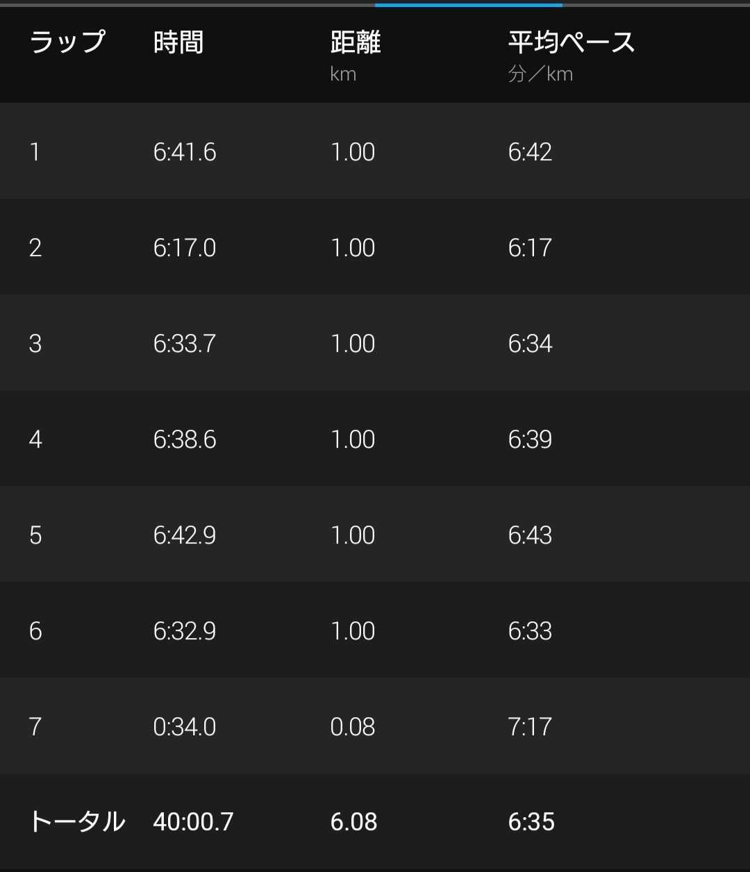 6km過ぎたときに残り30秒で40分だったので40分走りました。