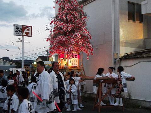 今日は、秋祭りでお神輿について歩いてきました。夜になる前から集まって、小学3年くらいからお神輿の上に乗って鐘をならしながら街中を1時間半ほど歩いて周ります。息子はもう途中で帰りたいと言っていましたが、最後まで歩いて、最後にお菓子が子供達に配られて終了です。それにしても愛媛の人の祭り好きには毎年驚かされます。終わっても直ぐには帰ろうとはしません。祭りのためなら、2週間くらい平気で会社を休む人もいます。もちろん、祭りの最中は会社もお休みです。みなさん8月頃から祭りに着る鯉口という服を用意しています。近くのスーパーでは鯉口は、もっとも目立つ場所にディスプレイされていて、このシーズン中は何処でも鯉口でいっぱいです。子供の鯉口で約8000円くらいで、大人用は10000円を超えます。毎年購入する人も結構いるみたいで、毎年この時期は鯉口の販売は忙しいようです。僕は興味がなかったので購入はしませんでしたが・・・長く住んでいたら、一着はいるでしょうね。ちなみに祭りは明日も行われるので、夜は鐘の音がカンカンカンと鳴り響きます。結構うるさいくらい響くんですよ。暴走族のほうが静かなくらいです。