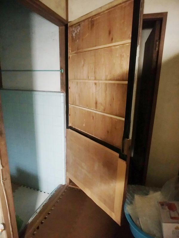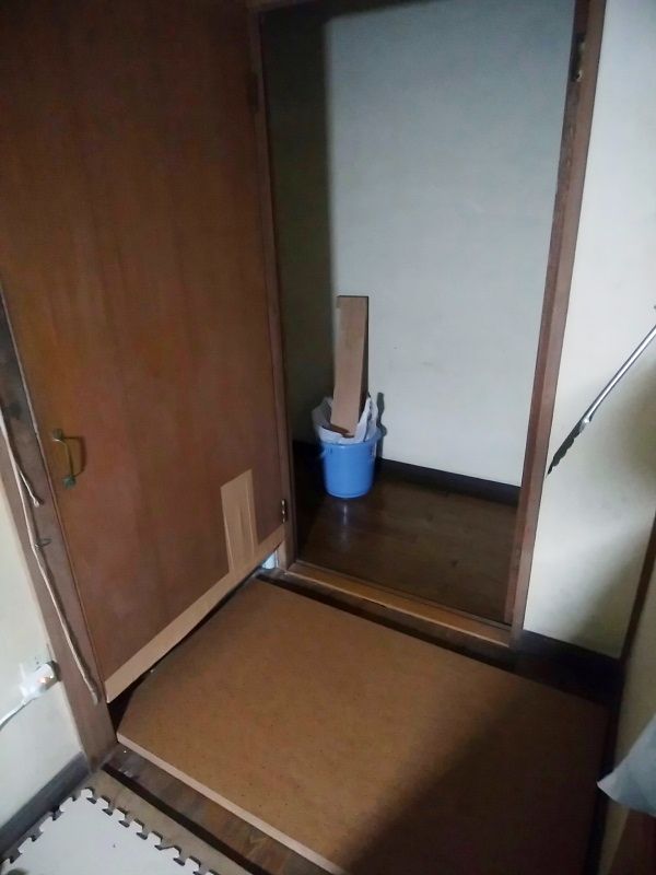 いずれにしてもこの風呂のドアまで朽ちていて、で、ちゃんと閉まらない。足元に板を置きたいがドアの底面が当たる。