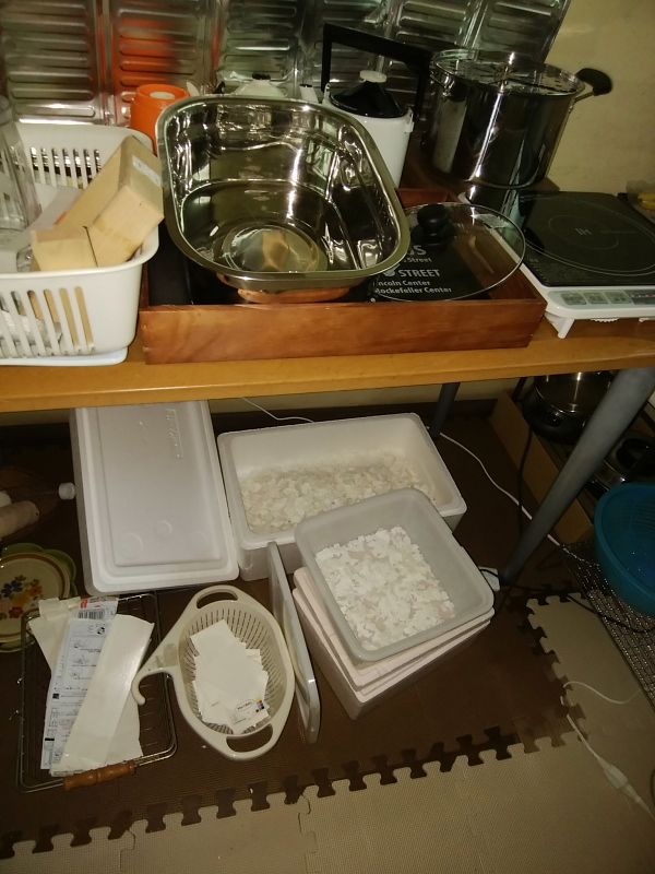 となりの風呂場は、今は牛乳パック置場だが、いずれはこっちも作業に使うか、それとも大きなトレーニングマシンを置いてしまおうか…。