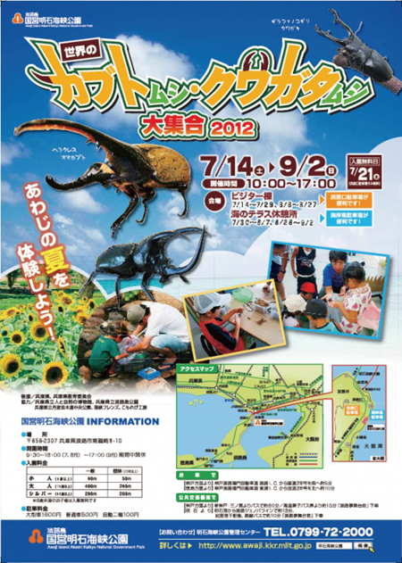 淡路市の国営明石海峡公園では、夏休み期間中、世界のカブトムシやクワガタムシの展示が行われています。公園内の生きものを観察する自然観察会や、折り紙や木の枝などでカブトムシを作るクラフト教室など、親子で楽しめるイベントが盛りだくさん!木工クラフトでは貯金箱や万華鏡なども作る事が出来るので、小さいお子様の夏休みの自由工作にもぴったりです!★世界のカブトムシ・クワガタムシ大集合2012★◆開催期間:9月2日(日)まで◆開催時間:10:00~17:00◆開催会場:国営明石海峡公園ビジター棟(7/14~7/29・8/8~8/27) 国営明石海峡公園海のテラス休憩所(7/30~8/7・8/28~9/2)◆問合せ先:淡路島国営明石海峡公園(明石海峡公園管理センター) 〒656-2307 兵庫県淡路市南鵜崎8-10 TEL/0799-72-2000