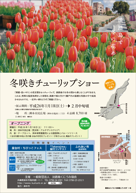 「博愛・思いやり」の花言葉を持つチューリップ。淡路島では冬の間から楽しむことができます。本年度は、4品種・10,200球のチューリップを洲本市民広場(洲本市)、兵庫県公館(神戸市)において展示し、淡路島の温暖な気候の中で1月中旬頃から咲き始め、約1ヶ月程度楽しむことができます。淡路島の冬の名物、水仙郷と合わせて一足早い春の訪れをお楽しみください。・展示期間:平成26年1月18日(土)~2月中旬(天候により開花が前後することがあります)・展示場所: 兵庫県洲本市塩屋1丁目 洲本市民広場(4品種 約8,700球) 兵庫県神戸市中央区山手4-4-1 兵庫県公館(1品種 約1,500球)・問合せ先:一般財団法人淡路島くにうみ協会 事業第1課・電話番号:0799-24-2001