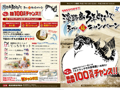 「淡路島3年とらふぐを食べて、買って景品総額100万円チャンス!!」が合い言葉の、淡路島3年とらふぐ・3つの福キャンペーンを今年も開催します。キャンペーンの内容を簡単にご説明いたしますと、淡路島3年とらふぐ を食べる・購入すると証明書兼応募ハガキがもらえます。証明書に付いているスクラッチクジを削って当たりがでたら、応募ハガキに必要事項を記入しご投函ください。後日、事務局より賞品を発送いたします。スクラッチクジがはずれても、応募すれば現金10万円と現金5千円が当たるWチャンスもあり!※2016年3月15日(火)までに応募葉書をご投函して頂いた方が対象といったものです。・キャンペーンの詳細はこちらちなみに渚の荘 花季では、宿泊プラン「【特選】淡路島3年とらふぐづくし」または「淡路島3年とらふぐ三昧」でご予約を頂いた場合にお渡しさせていただいております。淡路島が誇る冬のブランド食材を、ぜひご堪能くださいませ。・「【特選】淡路島3年とらふぐづくし」はこちら・「淡路島3年とらふぐ三昧」はこちら ※3つの福キャンペーンの宿泊対象期間は、 2015年10月1日(木)~2016年3月15日(火) となります。★ 淡路島3年とらふぐ とは?抜群の自然環境と潮流を持ち、世界三大潮流の一つに数えられる、淡路島南部の鳴門海峡。その福良湾沖鳴門海峡のほど近くで限りなく自然環境に近い状態で育てられる 3年ふぐ はその運動量から、身が引き締まり旨みがたっぷり。一般的にトラフグは急激に成長させて2年で市場に出すために旨みが少なく運動量が足りない為にゆるい身になってしまうそうですが、3年物のふぐはゆっくりと3年の月日をかけて大事に大事に大きくなるまで育てられる、そして天然のいかなごなどこだわりの上質な餌により、旨み十分で抜群の身の締まりになるそうです。重さは2年物の2倍近い1.2~1.8キロ程にもなります。