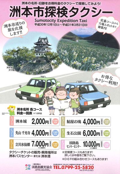 洲本高速バスセンターと洲本港を発着点として、市内の観光名所を定額でお得に往復する「洲本市探検タクシー」が、3月末までの期間限定で運行中です。洲本城や淡路モンキーセンターなどの定番スポットから、鮎屋の滝・生石公園といった穴場スポットまで、コースは全部で6種類!洲本市内のグループホテルからは洲本高速バスセンターまでシャトルバスをご用意していますので、徒歩での移動も少なく宿泊と観光がセットで楽しめますよ♪ぜひこの機会に洲本市の観光名所を探検してみてくださいね!【洲本市探検タクシー】※2019年3月31日(日)まで・Aコース:洲本城(2,000円) 国指定史跡で続日本名城100選にも選ばれた城跡。・Bコース:鮎屋の滝(4,000円) 霊験の場としても崇められている淡路島随一の滝。・Cコース:先山 千光寺(4,000円) 淡路富士と呼ばれる先山に建つお寺で、国生み神話ゆかりの地。・Dコース:生石公園(6,000円) 大阪湾と紀淡海峡が一望できる朝日の名所で、島内有数の梅の名所でもあります。・Eコース:立川水仙郷(7,000円) 日本三大水仙群生地として有名な淡路島でも古くから知られる水仙の名所。・Fコース:淡路島モンキーセンター(10,000円) 淡路島南東部に生息する約300匹の野生サルとのふれあいが楽しめます。【チケット販売所】洲本観光案内所(洲本高速バスセンター) 深日・洲本ライナー発券所(洲本港)【チケット販売時間】9:00~15:00【お問い合わせ:】淡路島観光協会(0799-25-5820)【洲本市探検タクシー(PDF)】