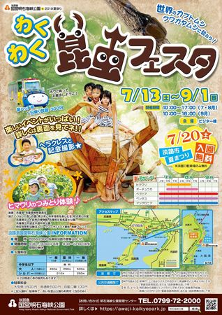 淡路島国営明石海峡公園で今年も「わくわく昆虫フェスタ」が開催されます。約40種類の世界のカブトムシ・クワガタムシの展示のほか、世界最大種の「ヘラクレスオオカブト」との記念撮影、ひまわりのつみとり体験などイベントが盛りだくさん。ほかにも「夏休み宿題おたすけ教室」として、自然素材をつかった工作教室や水ロケットを飛ばす体験など、夏のお子様連れのお出掛けにぴったりのフェスタです。7/20(土)には恒例の「淡路市夏まつり」が開催。朝から露店が立ち並び、夜には約5,000発の花火の打ち上げも。また夏まつり当日は、大人も入園料が無料になります!この機会に、夏の楽しさいっぱいの明石海峡公園へぜひお越しください。【わくわく昆虫フェスタ】 ・開催場所 淡路島国営明石海峡公園 ビジター棟 ・開催期間 2019年7月13日(土)~9月1日(日) ・開催時間 10:00~17:00(7・8月 開園時間 9:30~18:00) 10:00~16:00(9月 開園時間 9:30~17:00) ・入園料金 中学生以下 無料 大人(15歳以上)450円、シルバー(65歳以上)210円 ・お問合せ 0799-72-2000 淡路島国営明石海峡公園公式HP イベントのチラシ(PDF) 【第14回淡路市夏まつり】 ・開催場所 淡路島国営明石海峡公園 ・開催期間 2019年7月20日(土) ・お問合せ 0799-64-0001(淡路市役所 商工観光課) イベントの詳細
