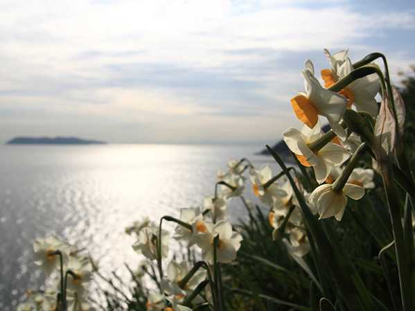 展望台からは、ニホンズイセンの鮮やかなレモンイエローとブルーの海との美しいコントラストをお楽しみいただけます。