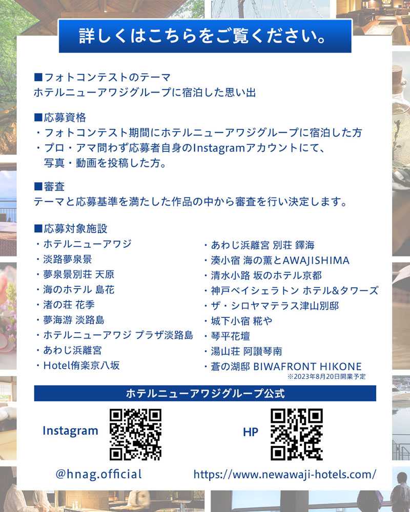 ※フォトコンテストにご参加いただいた方のInstagramの投稿を、フォトコンテストの審査や賞品提供とは関係なく、ホテルニューアワジグループ公式Instagramでご紹介させていただく場合がございます。その場合は、公式アカウントよりダイレクトメッセージを事前にお送りさせていただきます。