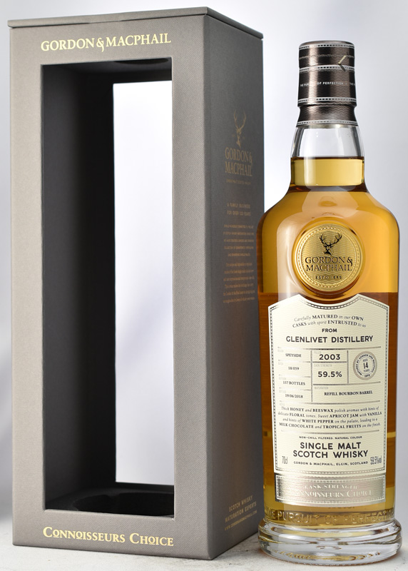 1895年創業、120年以上の歴史があり、シングルモルトの市場が誕生する前からシングルモルトをボトリングし販売していた老舗ゴードン&マクファイル(以下GM)社。創業当初より、シングルモルトの熟成を極めるために情熱を注ぎ、ウイスキーが出来た瞬間から自社で用意した樽に詰めて各蒸留所にて熟成、その後GM社倉庫にてボトリングの時を待つといったように、ウイスキーの熟成を自らで管理してきました。今年2018年、コニサーズチョイスが生誕50年を迎え、より一層バラエティに富んだアイテムが集約される新しいシリーズとして生まれ変わりました。今回は、GM新カテゴリーの中でも一番注目のシリーズとなっている「コニサーズチョイス カスクストレングス」から、初めてとなる「日本市場限定品」が登場です!しかも1樽からわずか157本の「グレンリベット」という世界が羨むNEW リリースですので、インポーター即完売の人気品迷っている時間はございません。◆グレンリベット2003 14年 / ゴードン&マクファイル コニサーズチョイス カスクストレングス 17150円(税込)容量:700ml 度数:59.5度