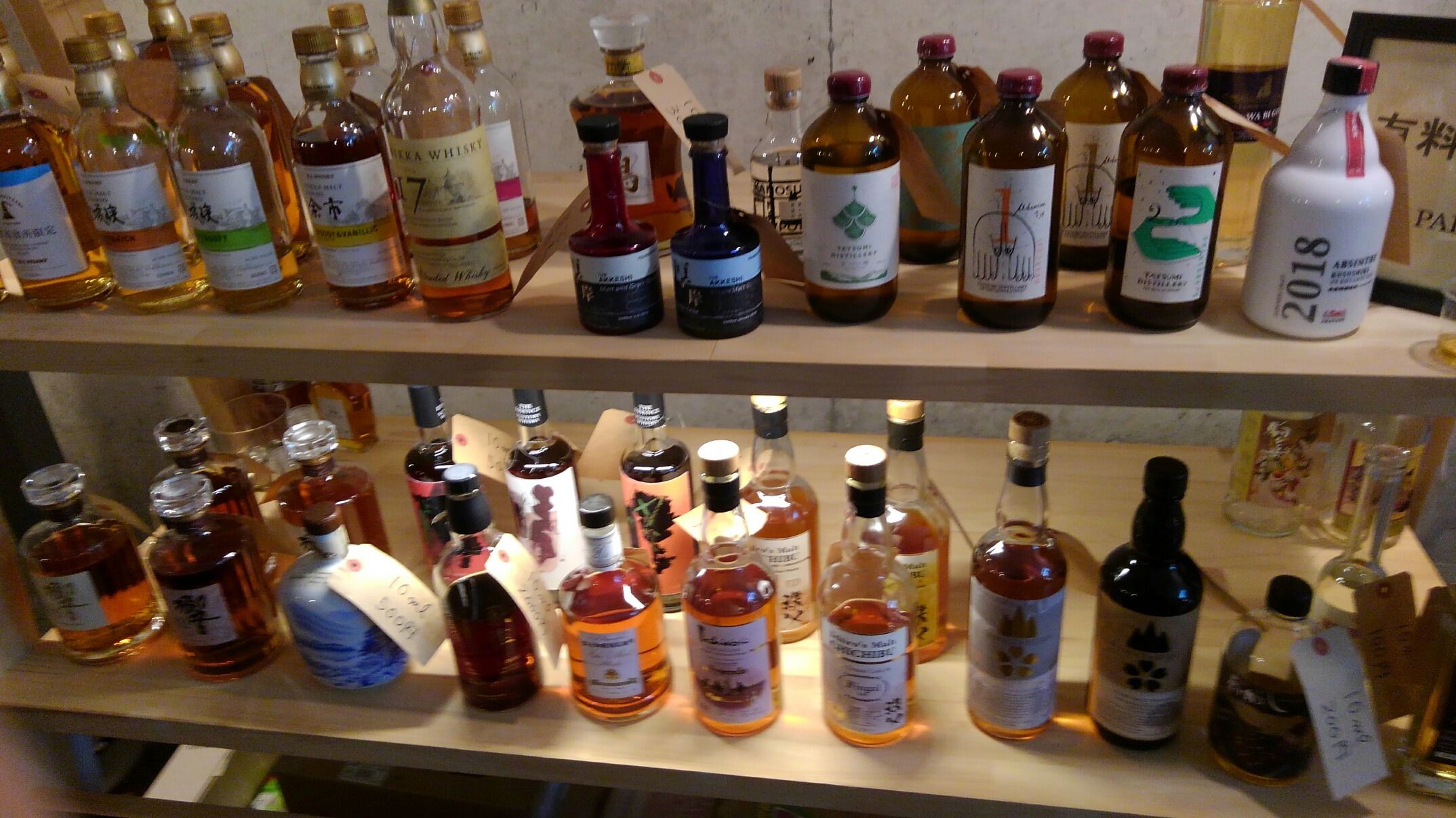 昨日いつもリカル配布店や有料会員等でお世話になってる酒育の会のイベント「ジャパニーズスピリッマルシェ2019」に秋葉原万世橋のマーチエキュートまで行ってきました当日は大宮ソニックでの「埼玉県の利き酒会」がありダブルヘッターの第一弾です、早速到着し谷島代表に御挨拶をし試飲開始まずは無料のコーナーで先日販売した滋賀県長濱蒸留所の試験醸造「アマガハン ミズナラ」を含む3種のブレンデッドモルトの試飲フィニッシュの違いでこんなに変わるのかと驚きみんなどれもバランス良くシングルモルトの完成が楽しみになりました、そしてジンコーナーでは何と言っても小正醸造のジン(これは残念ながら当店は扱いなし)2種特にほうじ茶ジンはほうじ茶好きの自分は初めての味わいでとても旨い、またみかんのボタニカルジンも初心者の人にもうけそうで旨い、そして有料試飲コーナーまずはニッカのオールドブレンデッドを試飲モルトの比率が高そうな麦芽の甘味をしっかり感じてとても円熟されたバランスでかすかにスモークも感じこれまた旨い、そしてイチローズの限定ボトルを2種飲んで最後はサントリー風雅??勉強不足で知らなかったのですが今ではかなりの高値で売買されてるそうで調べたところ 鹿児島の酒販店キンコーさんのオリジナル商品でかつて販売されたそうで、中身はなんと1984年蒸留の山崎シェリーカスクを中心としたブレンドウイスキーのようでこの色合いの濃さはなるほど納得出来ます。ラベルに描かれているのは、宇治の平等院鳳凰堂の鳳で名前の如くとても綺麗で品格のあるデザインです。中身は サントリー 山崎 白州 響 知多だそうで今では入手困難オールスター揃い踏みですね2000円の有料でしたが試飲しました旨過ぎます!!もうただそれだけ!!とても貴重なウィスキーを試飲出来満足したまま2時からのイチローズモルト肥土社長のトークショー20分弱の短い時間でしたが初めて肥土社長のトークシューを聞かせていただき第二蒸留所の秘話などとても勉強になりお人柄も感じ楽しいひと時でしたすぐさま肥土社長に挨拶だけして大宮の利く酒会場まで戻りましたちなみに「ジャパニーズスピリッマルシェ2019」29日まで開催されてますのでお時間のある方は是非行くってみてください