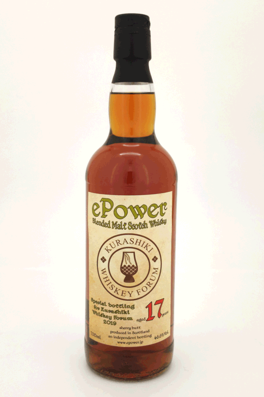ePower ブレンディッドモルト17 年シェリーカスク700ml 46.6%ブレンディッドモルトスコッチウイスキーKURASHIKI WHISKEY FORUM 2019 14200円(税込)株式会社ePower が倉敷ウイスキーフォーラム2019 のためにスペシャルボトリングをしたシェリーカスク熟成のブレンディッドモルトスコッチウイスキー。ラベルにはウイスキーフォーラムのロゴ入り、ボトリング120 本のみ限定本数の特別なボトルです。テイスティングノート色: 濃い黄褐色香り: レーズン、干しアンズ、りんご、かすかにバニラとウッディ味: ドライフルーツの甘さからウッディなタンニン、そしてドライ感へと続く熟成感と厚みがあるが同時に爽やかさも伴うフィニッシュ: ドライなうまみとウッディ感が続く豊かなフルーティな香りも鼻腔に残りとても心地良い 熟成感がありリッチな味わい重厚でありながら爽やかさもありとても心地よい余韻の楽しめる1本(インポーター資料抜粋)