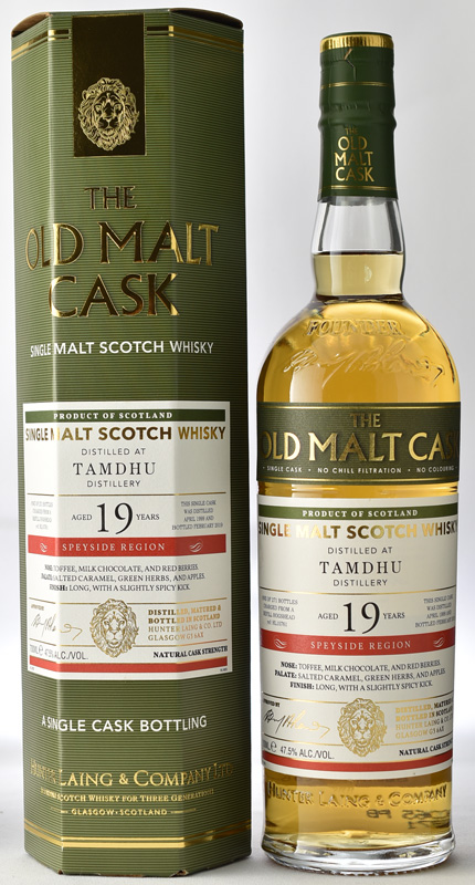 ハンターレイン社のフラッグシップ「オールド・モルト・カスク(OMC)」シリーズは通常アルコール度数50%でボトリングされていますが、加水される前に50%を切った場合、そのままの樽出し度数で稀に商品化される場合があります。今回のご紹介は、まさにそのレアスペックでリリースされた「タムデュー 1999 19年」になります。自然に落ちたこの度数の中熟スペイサイドモルトは、その年数以上に感じられる熟成感がありとても魅力的で、それが実力派蒸留所のタムデューとなれば興奮を抑えられません。OMC自体のNEWリリースが減っている中、なかなか見受けられないようなスペックのモルトは、手に入れておかないといけませんね!(インポーター資料抜粋)ちょうどこのブログのアップの前に先日当店のお客さんでウィスキーの情報元(いつも的確な試飲コメントや情報を勉強させていただいております)の常連さんから戴いたケイデン「ストラスミル」の小分け試飲を昨夜飲みその優しい味わいに感動し早速メールでやりとりして加水したのではなく樽の中で45,9度まで下がったのでそのような優しさが出ると聞きしかも19年熟成でこの価格このタムデューも期待できそうです!!◆タムデュー 1999 19年 / ハンターレイン OMC 15500円(税込)容量:700ml 度数:47.5度