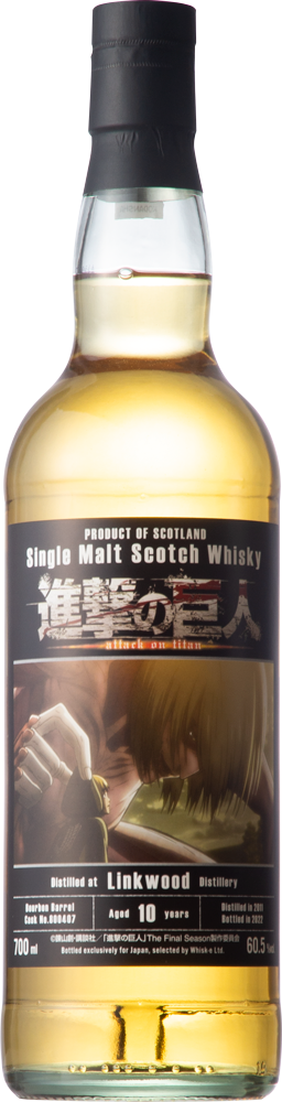 人気TVアニメ『進撃の巨人』とのコラボレーションボトル『リンクウッド2011 バーボンバレル』飲んでいて楽しくなる味わいのシングルカスク リンクウッド2011 バーボンバレル 60.5% 700ml 13200円(税込)【限定225本】バーボンバレルNo.800407 蒸溜:2011年 瓶詰2022年 リンクウッド2011 バーボンバレルはバーボンバレルの10年熟成で、シングルカスクのカスクストレングスボトリングです。 色は明るいゴールド。香りはジューシーなリンゴやかりんジャムといったフルーツのアロマ、ハチミツ、粒コショウ、ほのかに古書店のニュアンスもあり、空気と触れることでバニラクリームへと変化して行きます。味わいはドライアップル、柔らかなハチミツの甘味にブラックペッパーやジンジャーといった温かみを感じるスパイスが加わり、フィニッシュにかけてバニラクリームやレモンタルトが現れます。 リンクウッドのフルーティさやバーボンバレル由来のバニラもしっかりと楽しめるシングルカスクで、甘味と共に味わいの旋律を成すスパイスがバランスよく加わっているため、奥行きと深みが増し、飲んでいて楽しくなる味わいです。ぜひこの機会にお楽しみください。