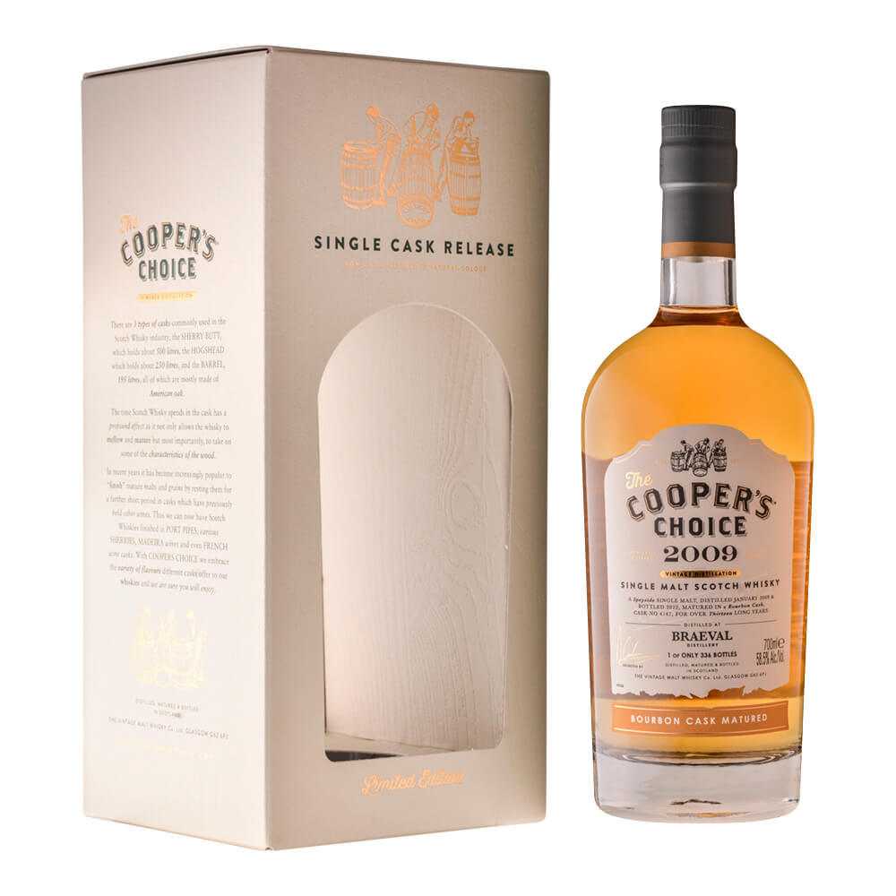 妥協なき樽職人の矜持(プライド)が熟む唯一無二のウイスキー かつて、ボウモア蒸留所で20年以上ゼネラル・マネージャーとして研鑽を積んだブライアン・クルック氏によって、1992年にグラスゴーにて創業。樽職人の名を冠した「ザ・クーパーズ・チョイス」は、その樽選びの独創性と品質の高さで今や世界20カ国以上に輸出をするほどの人気シリーズブランド。ザ・クーパーズ・チョイスブレイヴァル 2009 13年 バーボンカスク 58.5% 700ml 18400円(税込)【テイスティングノート】香り:ミルクチョコレート、オレンジピール、煮込んだリンゴ。味わい:ジンジャー、モルト風味のシュガーアーモンド、洋ナシ、スパイスとメープルシロップ。フィニッシュ:キャンディーシュガーとファッジ、スパイスの余韻が続く。情報原産国: スコットランド地域: スペイサイドブランド: ザ・クーパーズ・チョイス銘柄: ブレイヴァル蒸溜所メーカー: ザ・ビンテージモルト