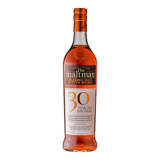 上質の樽選びの匠がもたらす「最上のモルト」名ブレンダーとして、数々のウイスキーをプロデュースしてきたドナルド・ハート氏と息子でありゼネラル・マネージャーのアンドリュー・ハート氏と一緒にボトラーズブランドを創業。その類まれなるブレンダーとしての経験と情熱は、数あるボトラーズ中から高い評価を受け上質の樽選びによるクオリティーで、数々の賞を受賞しています。モルトマニアから絶大な人気を誇るシリーズ。 ザ・モルトマンブレンデッドモルト 1992 30YO シェリーバット 47.6% 700ml 39800円(税込) 名ブレンダーであるドナルド・ハート氏によって創業され、数あるボトラーズブランドの中でも高い評価を受けている『ザ・モルトマン』。彼の選定した樽はいずれも素晴らしいものばかりで、今回リリースする30YOの超熟ボトルにおいても、極上のモルト原酒がブレンドされています。ピティヴェアック、アベラワー、カーデュ、トマーティン、グレンアラヒー、アバフェルディ、ブルックラディ、カリラの原酒をブレンド。 【テイスティングノート】香り:シェリーの豊潤なアロマ、くるみの焼き菓子、バニラの甘さ。味わい:サルタナレーズン、ハチミツ、シナモンロール、シェリーのスムースさと暖かみをさらに感じられる。フィニッシュ:アプリコット、ダークチョコレート、コーヒーのようにクリーミーな余韻。
