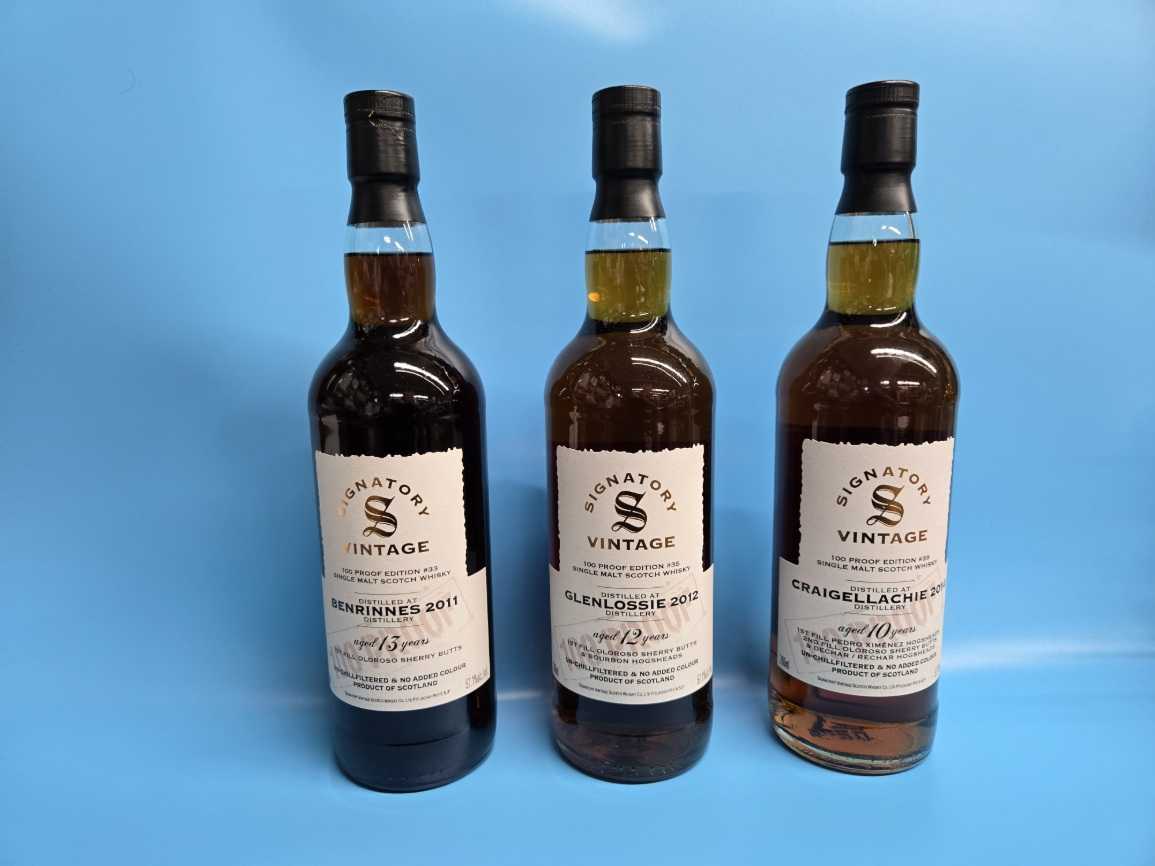 写真 左から 新・中核シリーズ】ブリティッシュ100プルーフ(Alc.57.1%)で瓶詰め、手頃な価格で気軽に楽しめるシングルモルトシグナトリー ベンリネス 2011 13年 100Proof 57.1% 700ML 7500円(税込) 1st Fill Oloroso Sherry Butts グレンロッシー 2012 12年 100Proof 57.1% 700ML 7500円(税込)1st Fill Oloroso Sherry Butts & Bourbon Hogsheads クライゲラヒ 2014 10年 100Proof 57.1% 700ML 7500円(税込)1st Fill PX Sherry Hogsheads, 2nd Fill Oloroso Sherry Butts & Dechar/Rechar Hogsheads