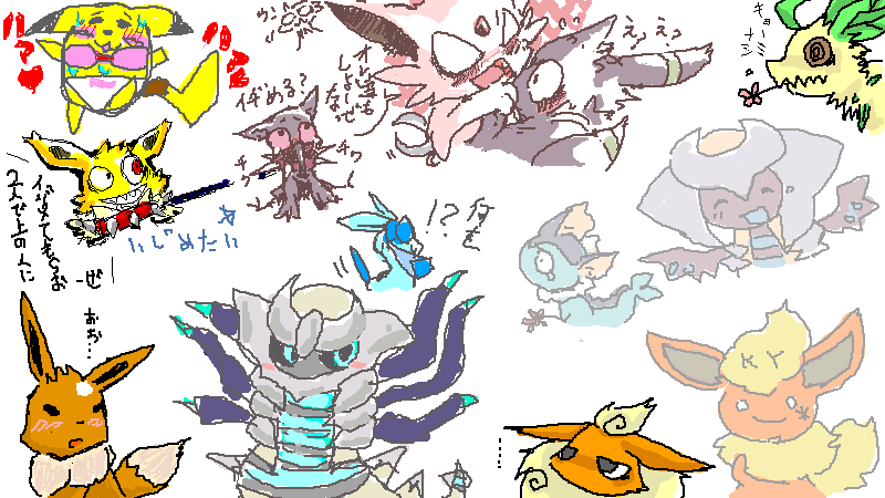 どもども一昨日マイピクの方たちと絵茶さしてもらいました。本当は昨日書くつもりだったんですが忘れてしまい…とりあえずうpいやはや、皆様本当にお上手で・・・ちなみに私は上の画像だと左上の何かはあはあいってるマゾっ気のあるピカチュウで、下の画像は右下の妙に眼力があるピカチュウです。上のピカチュウがかなりの人気でして、私としてもうれしい限りです。しかもこのピカチュウ、しっぽの先端がハートじゃないのでオスなんですね。キャプチャはしていないんですが、あともう一ぴき化粧をしているコイキングを描いたんですがこれもやはりオスでしてかなり好評でした。そして下の画像のグレイシア先生がなんというエロさ。・・・ふうベッキーもかいたよーノシ
