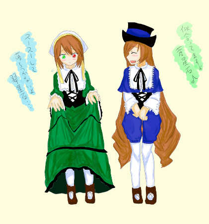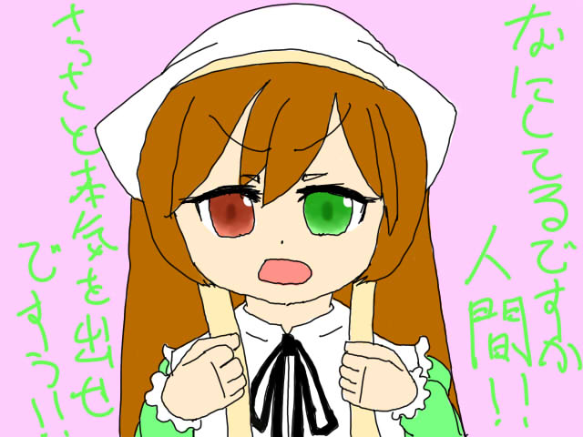 こんばんはー。今日は土曜日でしかも授業参観だったので3時間で終わったのだ。帰ってきて何をしたかというと、ディスガイア↓レベル上げ↓失敗してリセット↓やる気なくす↓vip↓絵描きスレ↓頑張るというわけでVIPの某絵描きスレで投下させていただいた絵を載せます。うpppppppp「鞄から勢いよく飛び出してくる翠星石」というお題をもらって描いたもの。見てのとおり、雑です。スピード感が全く出せません。「テニスのダブルスをしているドールズ」と「線香花火をしている蒼星石」と「エロおkな気分ならふたなり翠を騎乗位する蒼 えろNGなら俺(orJUMor梅岡or兎)をクロスボンバーする双子 」のみっつのお題をいただいたので全部混ぜてみた反省はしていない線香花火が全然目だってなくてちょっとなさけない気持ちになりました。というわけで描きましたお題をほとんどクリアできていなかったので描かせていただきました。線香花火の周りを明るくするのを忘れたのが失態でした。あとかおがおかしいです。「長座体前屈をする銀様」というお題をいただいて描いたものです。俺の頭の中では長座体前屈=体育着+今は消え去りしブルマなので着せました。「翠をセクハラする蒼」というお題をいただいて描いたものです。なんか全然えろくねーこの絵を描き終わったらぷつんと集中力が切れてかけなくなってしまいました。これを描いた時は「えろいwww」と言ってくれた方もいるんですが、やっぱりえろくねーなー。エロ絵を習得しないと二次元までもエロ規制がくるときに自己発電ができなくなるではないかまあそのために絵を描いてるわけじゃないんだけどね以上ですね。ちなみに投下した順番通りです。少しずつ丁寧になってますね。最初が雑すぎた。じゃあ明日部活の試合の応援にいくんでまた次回お会いしましょうさよなら