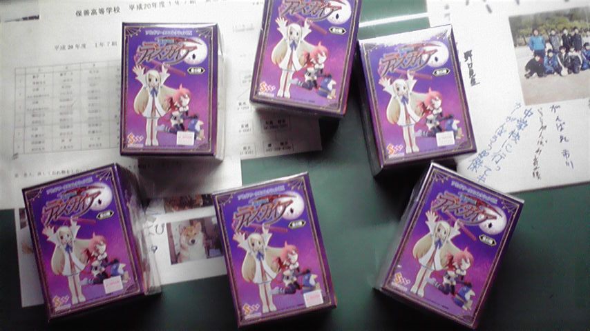 みなさん!!!!!!!!!重大な発表です!!!!!1111我が家新しい家族が来ました!!!!!!!11111111111さて、新しい家族を買ってきたわけですがディスガイアのフィギュアです。全六種類です。なにがでるかななにがでるかなwktkサムライ!!!サムライでもトップクラスのショウグンはかなり強くてよいです。一軍に入っています。エトナ!!!!プリニーかわいすぐる。エトナパンツ見えます。サムライセカンド!!!!だぶっちまったぜ。さあつぎどんどん行こうか。フロン!!!!11持っているのは世界樹の杖かな?サムライサード!!!!そんなに俺のことが好きなのか・・・・エトナセカンド!!!くやしいのうwwwwくやしいのうwwwwwww一番ほしかったアチャ子とまほこがなかったのが一番悔しいです。明日また買おう・・・ちなみに735×6で4410円です。新しい家族達。まいふぁみりー全員集合。ディスガイアの話。マージョリーとプリエを仲間にしました。現在の一軍。名前 職業 レベルマージョリー(伝説の魔女) 2513ラハール (魔王の息子) 2288アニエス (ショウグン) 2030テファ (銀河魔法使い)2020ネレイド (究極超魔人) 2018アリス (超天使兵) 2014リルル (宇宙海賊) 2001プリエ (魔王) 2000超魔王バールが倒せねえ。なんだよ4000れべって。全員4000レベにして魔界ウォーズと超合金ロボスーツを盗んでボッコしたいと思います。宇宙銀河ブレードのレジェンドが見つかりません。普通の奴なら持っているんですがレジェンドじゃないと超加速装置と魔界網羅だっけ?が手に入らない。アイテム界にもぐって必死に探したいと思います。DS版発売は明日!!