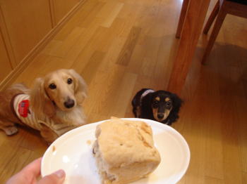 昨日は天気悪かったですが、今日は晴れたので、昨日の洗濯したものを外に出して、ぱりっと乾きました♪やっぱり晴れの休日はいいですね。マイキー・アーミーも朝は徳川園までお散歩できました。(アーミーは半分だっこ状態でした)で、夜は主人の両親と、主人のお姉さんが家に来て母の日なので、食事をするという予定だったので、お土産になれば~とパンとマフィンを焼きました。これ一応、マフィンです。マフィンケースがなかったので。。今日はカマンベールチーズ入りパンです。試行錯誤して、二次発酵後、焼く前に卵の黄身を塗ることで、焼きすぎを防ぐように。。マフィンはマフィンカップが切れていたので、四角いパウンド型で焼きました。これはアールグレイ紅茶を絞って入れました。けっこうおいしくできました。ちょっと形が崩れやすいですが。。マフィンカップは常備しておかなくては。。マイキー・アーミーも大興奮です。(もらえないけど・・)食事会ではマイキーは異様に興奮して、ワンワンうるさかったです。アーミーはおとなしいのにな。。でもアーミーはお散歩途中の家にいるシェパード二匹に果敢に吠えていました。小さいのにえらかったです。