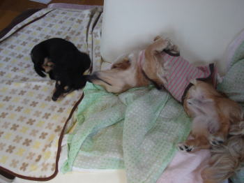 マイキーは昨日の夜は、実は自分でも歩けないくらい弱っていました。たぶん、病院で打った注射が足の神経に障ったのかも。。これには本当に心配しました。下痢だけでなく、歩けなくなっていたので、本当に心配しましたが、今朝は普通に歩いていて、マイキーの好きなボールをくわえたりて遊んだりもできました。いや~、本当どうなるかと思いました。マイキーもアーミーの前でもヘソ天で寝られるように・・アーミーのブリーダーのユカリさんにいろいろとアドバイスをいただいたので、本当心強かったです。ありがとうございました。今日は連休最後の日。ちょうど雨だし、マイキーとアーミーにはゆっくりしてもらうつもりです。私と主人は午後から葉加瀬太郎など、数名が出演する、「ライブイマージュ」のコンサートに行って、ちょっと癒されてきます。今年の連休はなんだかあっという間だった気がします。でも冬物の片付けや毛布3枚洗えたし、ミシンかけやパンつくりもできたし、いろいろ家のができたから、よかったかな~。大分、良くなったね。