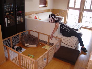 昨日の午後から我が家では大変なことになっていました。マイキーが下痢をおこしてピーピーに。。原因はストレスのようです。今まで、ひとりのんびり過ごしてきたマイキーにとって新しく来たアーミーの存在にまだなじめていないようです。マイキーがいままでごろんと横になっていたソファーの角はアーミーに占領されてしまうし、マイキーがおもちゃで遊んでいるとアーミーがやってきて横取り。。マイキーも反撃すればいいのに、おっとり屋の性格のためできなくて、シュンとあきらめてすねていました。で。。とうとうストレスがたまって下痢になってしまいました。。マイキーとんだGWになっちゃってごめんね。。徐々に慣れさせていけばよかったね。。ということで、以前マイキーが子犬のころ使っていた、主人の手づくりの柵をまた出してきました。これでアーミーと区切ってアーミーをずっとフリーにせずにアーミーを外に出す時間を決めて慣れさせようと・・後はリビングダイニングの隣にある、主人の部屋の扉を閉めて、リビングダイニング(こっちはマイキー)・主人の部屋(こっちはアーミー)などど分けて放し飼いにするなどにしております。犬も人間と全く一緒ですね。。マイキーにはかわいそうなことしてしまいました。昨日は病院にも行って、注射を打たれ、安静にしています。明日には元気になって、またマイキーの元気いっぱいが見られるように・・