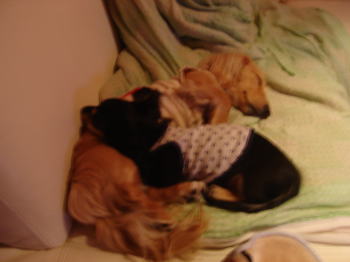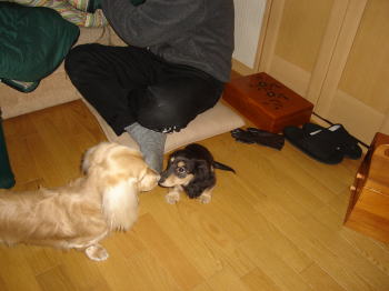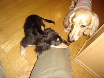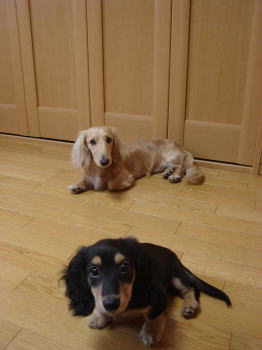 最初はどうなることやら。。と思ったのですが、このところ仲良くやっています。一緒に寄り添って寝てたり。。ちゃんとアーミーはマイキーがお兄ちゃんだと分かっているようです。だから、マイキーにちょっと甘えた感じにも見えます。最初の頃はマイキーは訳わからず、ストレスためて、下痢ピーになって大変でしたが私が、二匹目を飼うメリット(犬同士遊んで、犬は犬、人間は人間の時間が持てるようになる)というのがちょっとずつできてきました。マイキーも以前よりもただのおっとり屋からちょっとしっかりモノになってきたような。。これからアーミーも大きくなって、どんなツーショットに変わっていくんでしょうね~。楽しみです。