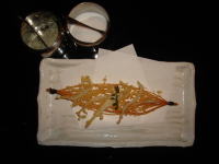昨日は私の誕生日でした。が・もう30歳すぎるとそんなにうれしくはない・・気がします。主人も早めに仕事が終われたので、近所にある、一番お気に入りのお店、天ぷら屋さんの「テンペイロ」というお店に行きました。http://www3.starcat.ne.jp/~kamehiko/frame2.htmこのサイトからお店のVTRが見られます。ここは自分達のテーブルの近くまで動く天ぷらフライ機械をもってきて目の前であげてくれます。この天ぷらの下のカゴまでも食べられます。これは昆布で編んであるのです。創作ですね~。さすがです。ここは2階が「亀彦」というカウンターの天ぷら屋さん(本格派!)なのですが、私達は3階にあるこちらの息子夫婦さんがやっている「テンペイロ」の方に行きます。2階の同じメニューでも3階のほうがぐんと安いんです!またマスターとの会話もおもしろいし・・なにより飲みすぎても家が歩いて2分なので千鳥足で帰れますから。。たぶん内容は、栄(名古屋の繁華街)で食べたらコースで1万円以上はするものが、こちらは5000円以内です。また天ぷらの形がかなり芸術的でもあります。食材にもこだわってます。とろろ芋をたたいてそれを海苔巻きのようにして真中にうにを入れたり・・と創作天ぷらが多くて何を食べてもおいしい!です。今日はマスター推薦の「お誕生日スペシャルコース」をいただきました。天ぷらだけでなく、長野で取れた山菜なども楽しめます。私達はこの界隈では、ピカ一!のお店と思っています♪今日は仕事ではトラブルばっかりで携帯の電池が切れるくらい忙しかったのですが、夜はいい誕生日になりました♪バタンキューで、寝てしまい。。今朝は朝5時半に起きて、雨が降る前にマイキー・アーミーのお散歩ができました~。お散歩終わってまったりです。