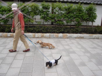 アーミーが我が家へ来て二日目。今日は、朝10時くらいからマイキーはお散歩、アーミーは私がだっこで、主人もみんなで(家族総出で)歩いて数分の徳川園に行きました。そこで、ちょっとアーミーも歩いてみました。もう3ヶ月ですから、あと少しで正式なお散歩デビューできます。けっこう歩き方もしっかり。これから楽しみです♪その後、徳川園の近所のエムズクラフトさんに久しぶりに行って、マイキーの新しいハーネスとリードをオーダーしました。(エムズクラフトクラブ・http://homepage2.nifty.com/mscclub/)このお店には、アウラ君とニキちゃんという白と黒のラブラドールちゃんがいます。二人にもマイキーとアーミーが挨拶。多頭飼いの先輩として、これからもよろしくお願いします♪主人が今日はまるで、保父さんのように、マイキーとアーミーのお世話をしてくれました。ちょっとは慣れたようです。でもマイキーがなんだかスネ気味なのが気になります。今までは、一人っ子で愛情独り占めだったもんね。これからも変わらないから安心してね~。そのスネたマイキーがなんともいじらしく、またかわいさ倍増ですね。。明日は主人が友人の実家の田植えの手伝いなので、私がマイキーとアーミーのお世話をします。がんばります~。でもアーミーはおトイレがほぼ完璧なので、すごく楽です。マイキーの最初の頃は本当大変だったな~。