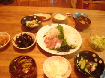 今週の木曜日には家にきていましたが。。今日午後ようやくキッチンに設置できました!今は我が家にヘルシオがきたことの達成感で、まだ何も使い方が分かってないですが・・徐々に覚えていきたいなと思います♪それでパンつくりも・・♪ウォーターオーブンだから、焼き上がりが水分抜けすぎってこともなくなるかな~。今日は明日から雨だということなので、久しぶりにお布団が干せたり、沢山洗濯ができたのでとても気持ちのよい日でした。(かなり暑かったですけどね。。)<夕飯>最近どうも暑いせいか、夜に食欲があんまりない私です。メインはお刺身にしてみました。我が家のコンテナガーデンでできた、シソも一緒に・・またなぜかマイブームはあさりのお味噌汁です。どこかのランチで食べたこのお味噌汁がすごくおいしく・・最近良く作ります。お刺身のお皿は友人の結婚式の引き出物のロイヤルコペンハーゲンのお皿です。ロイヤル~は和食にもよく合う、すぐれものですね。またリチャードジノリのホワイトシリーズも好きです。(我が家でも使ってま~す)マイキーアーミーたちです。朝7時前からお散歩してお昼間はまったりです。今日はお昼間ちょっとだけおでかけしました。