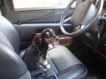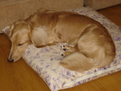 月曜日はちょっと涼しくなったかな~と思ったのですが、今日も暑かったですね。今日は会社から車で片道45分くらいの豊田市の方に仕事に行っていて、その陽射しが結構暑かったのでなんだかちょっとバテ気味になってしまいました~。営業車に乗りながらも、日焼け防止の腕カバーとサングラスをしている怪しい私です。(とても怖くて写真に収められません。。)さて、暑いと、朝のマイキーアーミーのお散歩が短めになってしまいます。夜が長めですね~。早く涼しくならないかな。。このマイキーの乗っているカバーはお手製のものです。以前はブラウン系が多かったのですが、この座布団(もう一つあります)の上で、ガムを噛んだりしているため、どうも白い汚れが目立ちまして・・白っぽいカバーに変えてみました♪ミシンで直線縫いなので、あっという間にできました。ミシンは本当にベンリです。