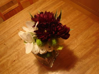 台風来る来ると言いながら雨も降らず。。さすがに明日の朝のお散歩はムリそうですが。今日は朝晩とお散歩できました。仕事も行く先で「ああもうすでにお盆モードだな・・」という感じがします。特に三河地方の会社は、トヨタ系・三菱系などの会社が10連休あったりするのでそれにあわせてお盆休み取るところが多いです。うちの会社はサービス業なものですから・・特に会社が一斉に休むことはないんですね。私はたぶん、15日(火曜日)あたり休んで、あとは、私の上司(支社長)がお休みするので、その間、出社する予定です。この9月には一年ぶりにNYに行こうと思っています♪家を買ったり、マイキーを迎えたりとあって、この一年以上、長い海外旅行は行っていなかったのですが、会社で一応、私は勤続10周年の旅行の補助と9連休の休みがもらえるので、それもあって休もうかな~と思います。また去年は忙しすぎて、夏休み1日しかありませんでしたから~。そんなわけで、お盆休み返上で仕事する予定です。(でもたぶんヒマですね~)結婚式で、テーブルに飾ってあったお花をいただきました。最近、この大きな菊のようなお花多いです。たぶん、今流行りのお花なんでしょうね。