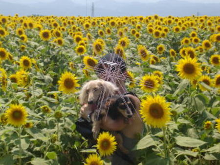 やっと念願かなって、ひまわり畑に行くことが出来ました。場所は、山梨県北杜市明野町というところで、(中田ヒデの出身地韮崎の近くです)映画「今会いに行きます」のロケ地になったところです。2年前にこの映画を見て、このひまわり一面のシーンが忘れられず、いつか行きたい!と思っていました。名古屋から山梨って遠い・・と思いましたが、高速道路(中央道)で行けば、3時間半くらいでした。(と言っても、私は座っていただけで、主人が行き帰りとも運転してくれました~)日陰がないので、とても暑いので滞在時間は短かったです。でも本当に感動でした。観光客でにぎわっていました。ちょうど、サマーフェスティバルというのをやっているのでバスも沢山留まっていました。以前楽天ショップで買ったペットハンモックが大活躍でした。昼は地面が暑いですから・・ワンコは歩くのが辛いです。帰りには駒ケ根サービスエリアだったと思いますが、ドッグランがありました。(無料です)きれいで、またみなさんマナーがよくて一緒に楽しく遊べました。マイキー達も暑い中、がんばってくれました。ひまわり畑の後は、日陰のお店で水浴びしていました。とてもきれいな所でした。夏のいい思い出になりました♪