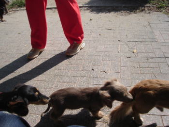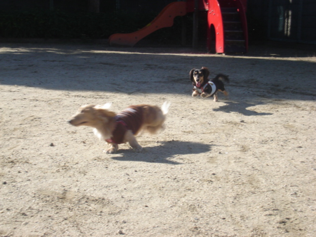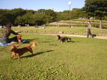 アーミーの実家、ピアニシモさん主催の同窓会が港区のドッグランでありました。お天気にも恵まれ、とても楽しい時間をすごすことができました。やはりピアニシモママさんのお人柄だな~。皆さんたくさん集まりました。で、今までブログでしかお会いできなかった子たちにも会えました♪まずは、桜餅家のモッチちゃん。この子はアーミーがピアニシモ家を巣立つまで、ずっと一緒にすごしていた言ってみれば幼なじみなのです。モッチちゃんは覚えているようでした。たぶん、アーミーも。。小さくてかわいかったです。モッチちゃんのお姉さん、桜ちゃんも小柄で元気いっぱいな女の子でした。マイキーアーミーは実は大勢の犬に囲まれるのがあんまり好きではないので。。マイペースでまったりのんびりしていました。アーミーは人影にかくれんぼばっかり。アーミーはやはり怖がりやさんなので、かなり吠えてました。きっとエネルギー使っただろうな~。また最近ピアニシモさんを通じて知り合ったルーク・アッシュ・ティガちゃんたちにも会えました。珍しい種類のワイヤーダックスです。ピアニシモ家は普通のダックス(マイキーアーミーのような)だけでなく、ワイヤーダックスの子もたくさんいます。みんなで15匹~20匹くらい?集まったかな。その半分がワイヤーダックスですから、こんなに多くのワイヤーちゃんが集うのは珍しいことでしょう。また集まりたいです♪