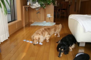 お待たせしました。先日ご応募いただいた、感謝祭のプレゼント企画の当選者発表させていただきます。一家で抽選会を行いました~。カメラマンは主人です。こういう動きのあるときのカメラはやはり一眼レフデジカメが活躍します。Aコースは長男犬・マイキーが選びました♪Bコースは次男犬・アーミーが選びました♪Aコースの当選者は、二匹のワンちゃんを飼っていて、ハンドメイドの作品や、おいしいグルメのお店をたくさん知っていらっしゃって毎日素敵なブログを書かれている、sweet.rose.bettyさんです。以前、手作りの石鹸をいただきましたが、本当買ったようにきれいで素敵な出来栄えでした♪Bコースの当選者はカフェ☆モカさんです。カフェ☆モカさんは、ほぼ毎日おいしそうな手作りパンやお菓子を作っていらっしゃいます。(以前、プレゼントでいただきましたが、本当プロ級です!)私はカフェ☆モカさんからパン作りの影響かなり受けています。最近はお仕事を始められたのに、前と変わらず、素敵なパン作りを続けていらっしゃいます♪また・・多数の応募が嬉しかったので、急遽、残念賞を作りました。外れた方の紙の中から、僭越ながら私が抽選させていただきました。(2ワン立会いのもと・・)で、残念賞は、毎日パワフルで素敵なブログを書かれている、Pyuaraさんに決まりました~♪おめでとうございました♪本当ささやかな気持ちばかりのプレゼントですが、ぜひお受け取りくださいね。3名の方はお手数ですが、メッセージボックスの方に発送先などをご連絡ください。お待ちしています。こうしている間に、私ももうすぐ出産間近。。出産前にこうしたイベントができて良かったです。これからもよろしくお願いいたします。