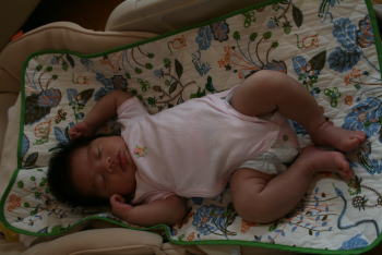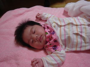 昨日は無事に一ヶ月検診に行ってきました。体重は順調に約1.5キロ増えて4450グラムになっていました。また先天性異常なども何もなく・・そして、私の体調も順調に回復してきているということでほっとしました。とりあえず、一区切りがついたな~という感じがしました。もう外にも少しずつ出られますから、今朝は朝5時起きだったので、朝の沐浴を済ませてから、6時半前からマイキーたちのお散歩も兼ねて、真織も涼しくて空気のきれいな朝のうちに外気浴。スリングに入ってのお散歩です。お散歩中の写真がないので・・・さっき洗面所で撮ってみました♪(片手で撮っているので、ちょっとブレてます・・)このスリング、わりと安い(4000円弱)なのに本当使いやすいです!出産前にネットで、このお店の口コミが良かったので買ったのですが、大当たりでした!前にベビーザラスで見たときはスリングが1万円近くしていて・・ちょっとなあと思っていたのですが、こちらの「プルーム」さんのは安いし、とっても使いやすくて真織は入るとすぐ「Zzz・・」と寝てしまいます。おなかの中にいる感覚と近いらしくて安心するみたいです。今日、もう一つ違う柄のをオーダーしようと思っています。7月に姉が買ってくれたコーチです。ちょっと大き目のサイズです。またこれもこのスリングとは別方向に斜めがけすることも。その格好に、マイキーたち引っ張って・・との格好はかなり笑えると思います。うちの近所ではもう定番のスタイルですが。。見る人は笑っているかも・・でも今朝も近所のわんこお散歩仲間のおばさんに真織もマイキーたちもかわいがってもらえました♪もう、私の格好は少々?でもいいっか・・と思っています。真織やマイキーアーミーが安全にお散歩できることが第一ですね!朝のお昼寝♪夕方の真織の授乳タイムとマイキーたちのご飯タイムと私たちの夕飯準備が重なる頃がいつもかなり忙しいです。