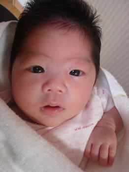 早いもので、今日で真織が生まれて一ヵ月です。なんだかあっという間でした。でも私の人生の中ではとても幸せで、慌ただしいながらもどこかやさしい時が流れていました。昨日体重を量ったら、4500グラムくらいになってました。一ヵ月で1500グラム増えて肉付きがよくなりました。生まれてきたときはほっそり小さく壊れそうな感じでした。肉づきがよくなって赤ちゃんらしくなっていい感じです。昨夜はめずらしく夜中一時から四時までぐずぐず泣き。私もそれに付き合って眠い~です。変な話ですが、赤ちゃんはハナクソが鼻の穴が小さすぎて取れないので、シッターさんいわく無理して取ると粘膜傷つけるし、吸引器は新生児には強すぎるから、なるべく赤ちゃんが自力で出すか、私が軽く吸ってだすかでやってね、と言われていて。。これで出なくて不快で泣いてました。見ている私も、代われるなら代わってあげたい・・といつも思います。。 真織は理由がちゃんとある時にしか泣かないのですが、その理由の一つがこの鼻問題なのです。。(>_<)早く鼻の穴が大きくなって自分で取れるようになるといいね!明日は一ヵ月検診にいってきます。私もかなり子宮の下がりがなくなってきました。私も産後の内診などあるみたいです。ここ2、3日、涼しい朝や夕方に真織もスリングに入って少しだけマイキーたちとお散歩。ご近所の方達やお散歩仲間の方にも真織を少しずつお披露目。みなさんに歓迎してもらってます。母親としてはとてもうれしいですね。