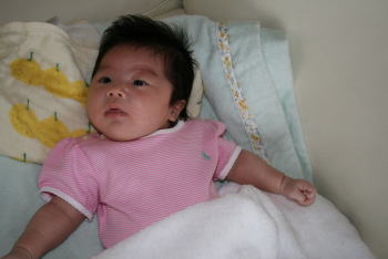 今朝は4時すぎに授乳してから、なんだか目がさえてしまってそのまま起きています。最近、私も夜の睡眠時間が細切れで、また夜中おきていたりて、リズムがいまいち・・ですが、昼間に昼寝(これがなかなか寝られないですが)して体力を補っています。今日は朝から検診です~。久しぶりの病院は楽しみです。真織にとっては生まれた場所に行くわけですから、ちょっとした里帰りみたいなものですね。(とは言っても車で3分ですが・・)さて、アップするのがかなり遅くなってしまいましたが、ブログで仲良くさせていただいているマッキーさんから出産祝いをいただきました。マッキーさんは私がブログを始めた3年以上前からのお付き合いでして、私はかなり影響を受けています。マッキーさんが飼っているダックスをいつか飼いたいと思い、家を買ってすぐにマイキーを迎えたり、また去年の9月にNYに行った時には感動の面会もできました!またパン作りやお菓子つくり、手作りワールドなど、とってもセンスが良くて素敵な方なんです。今も時々、お互い贈り物などのやりとりなどをして仲良くさせていただいています♪最近楽天ブログ復活されたんです。またご近所さんになりました~。で、いただいたのが、ベビーマットです♪小さいのは、今寝ているあやしベッドのところに敷いて汗取りなどにできます。柄がとってもかわいです。さすが海外ブランドですね。日本のだと、赤ちゃんものでこういうお洒落な柄はあまり見かけないんですね。またちょっと大き目のコットンマットも。これはもうすぐ寝返りをうつ練習の時に活躍しそうですね!今は撮影用で、授乳用枕にもたれさせてみました。ちょっと眠そう・・(この授乳用枕は大活躍です。これがあると授乳の体勢がとっても楽♪)マッキーさん、ありがとうございました。大事に使わせていただきますね~。はあ~、また今度はいつNY行けるかな~。いつか真緒も一緒に行ってセントラルパークとかお散歩したいですね。あまり泣くことが少ない真織ですが、泣いているところの写真を先日撮ることができました~。これはまさにハナクソがつまってぐるじ~と泣いているところなんです。(冷静に写真を撮る私もどうかと思いますが・・)かわいそう。。でも赤ちゃんって本当、泣くときは真っ赤!名前のとおり赤ちゃんなんです。最近は目が開いていることも多くなりました♪この服も前はぶかぶかだったのに・・もう小さくなってきたような。。