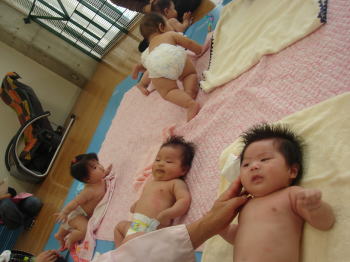 昨日は出産した病院でやっているベビーマッサージ教室に初参加でした~。一回1・5時間くらいで1000円でかなり良心的です。右端が真織。その隣が心ちゃんです。向きグセ直す体操を教えてもらいました。うつぶせとか、体ひねりとか、真織はかなりご機嫌にやっていました。むきグセ直し体操中・・がんばっています。バスタオルでゆらしっこ。ちょっとした赤ちゃん遊びも教えてもらいました。マッサージだけでなくいろんな月齢の子がいて、「5ヶ月にはこうなるんだ~」みたいなことも勉強になりました。またうちから歩いて200メートルくらいに住むママさんとも知り合いになりました。真織と一日違いで出産したそうです。以前も後期の母親教室で会ったことはあるのですが、その時は、大勢いたし、挨拶しかしませんでしたが。今日は、隣でマッサージやっていて、話していたら、誕生日が一日違いでしかも女の子だったので、とても親近感が沸きました。入院中は会わなかったです~。心(こころ)ちゃんという名前の子でした。心ママさんは二人目なんですが、上の子が幼稚園にいっている間、毎日尾お散歩兼ねて二時間近く歩いているそうで・・かな~りスリムでした。(また年齢も30歳前かな?若いっていいな・・!)やっぱり、産後のダイエットにはウォーキングはいいみたいです!来週あたり、一緒にお散歩するつもりです。(私は二時間は無理~ですが・・)ジーンズは入ったものの、仕事用の黒いパンツなどはまだちょっとキツイ。。もっとがんばならくては。。さっき、雨降る前に30分みんなでお散歩してきました。天気いい日はウォーキング当分がんばります。ただし、抱っこ紐がずっしり・・鍛えられます。これから、妊娠7か月の友人と、会社の先輩と3人でランチです。ソファ席ゆったりなお店なので、真織も一緒です!最近、赤ちゃん連れでもいいお店選びが上手になってきました。これも慣れですね!アーミーもおにいちゃんです。アーミーは真織がすきなんですね~。